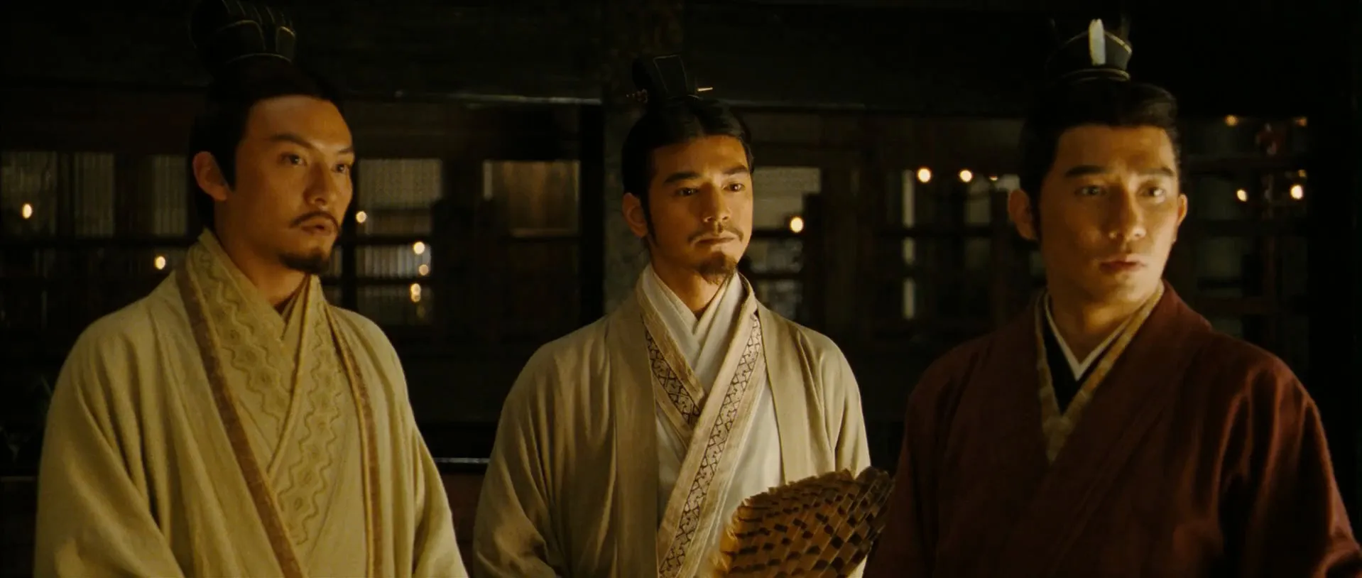 Cast: Tony Leung Chiu-wai as Zhou Yu, Takeshi Kaneshiro as Zhuge Liang, Zhang Feng Yi as Cao Cao, Chang Chen as Sun Quan, Zhao Wei as Sun Shangxiang, Hu Jun as Zhao Yun, Shidô Nakamura as Gan Xing, Chi-Ling Lin as Xiao Qiao, You Yong as Liu Bei, Hou Yong as Lu Su, Tong Dawei as Sun Shucai, Song Jia as Li Ji, Mijid Baasanjav as Guan Yu, Jinsheng Zang as Zhang Fei, Zhang Shan as Huang Gai, Wang Qingxiang as Kong Rong, Wang Hui as Cao Hong, Xie Gang as Hua Tuo, Shi Xiao-Hong as Jiang Gan, Xu Fengnian as Zhang Liao, Guo Chao as Yue Jin, Hu Xiaoguang as Xiahou Jun, Cui Yu-Gui as Xu Chu, Jiang Tong as Li Tong, Ma Jingjing as Wei Ben, Zhen Yi as Cai Mao, Jia Hongwei as Zhang Yun, Zhao Cheng-Shun as Xun You, Zhang You as Soldier